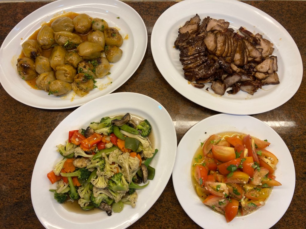 Homemade doesn’t have to be boring. In fact, we were treated to a homemade dinner tonight and it looked like it was from a restaurant. Stuffed onions (with meat inside), roast pork, mixed vegetables and tomato salad.