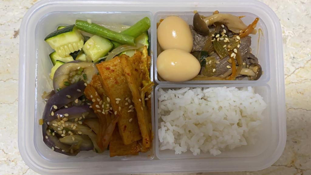 Yes, Val was at it again – more amazing lunch boxes! Val saw my cheesy baked eggplant recipe and she was delighted that great minds think alike (ha ha, so much for humility). She cooked Korean eggplant namul, stir-fried zucchini and green beans, soy braised quail eggs, beef bulgogi, and stir-fried fish cakes for Monday’s lunchbox.