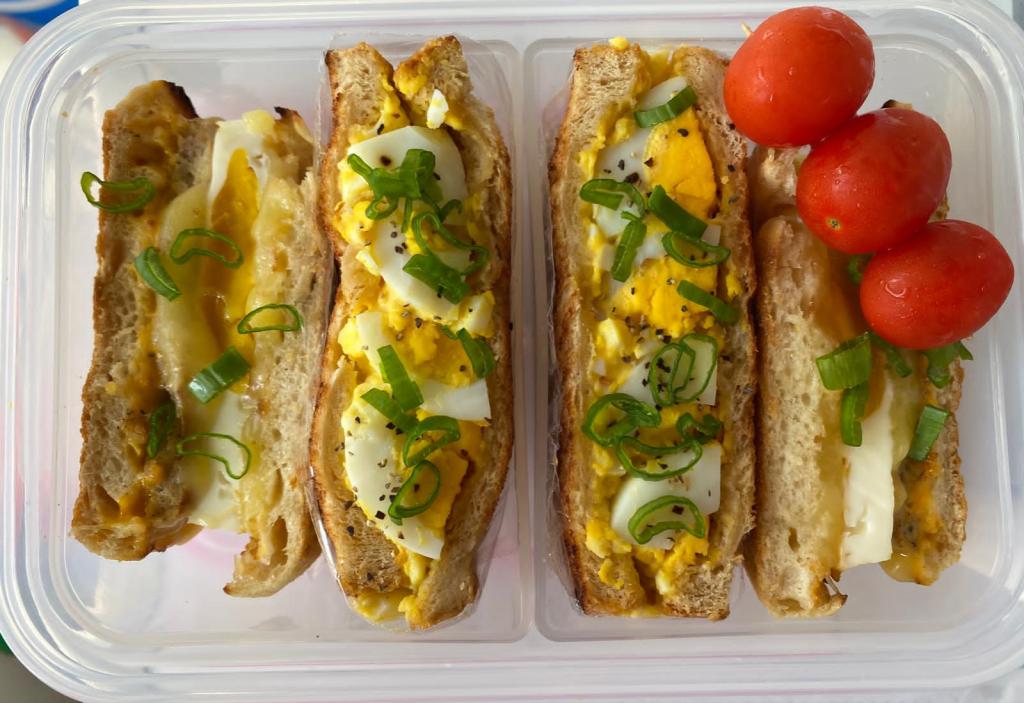 Tuesday’s dinner box was unusual for Val, because it was without rice. She had to have dinner while attending a training course, so sandwiches were more practical. Egg sandwiches can be artistic, healthy and tasty.