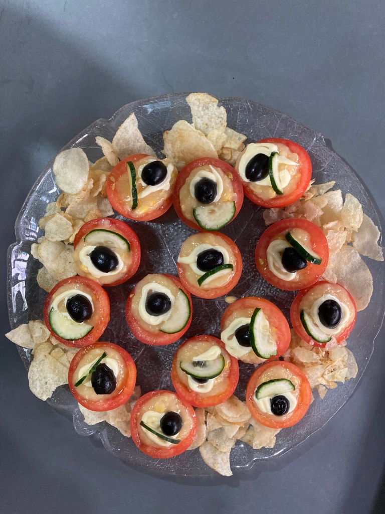 The Holy Week services began on Maundy Thursday. I needed a special starter for the celebration dinner, but it had to be simple. I had a lot of tomatoes, cucumber, some sweet corn, olives, Japanese mayonnaise and potato crisps. I put together a salad appetizer in a matter of minutes, which kept everyone happy. The only thing I had to do was to remove the seeds from the tomatoes and to add the sweet corn (cream style) in.