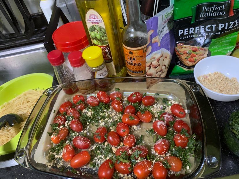 - Pre-heat oven at 350°. In a baking dish put cherry tomatoes, olive oil and feta cheese, salt and pepper