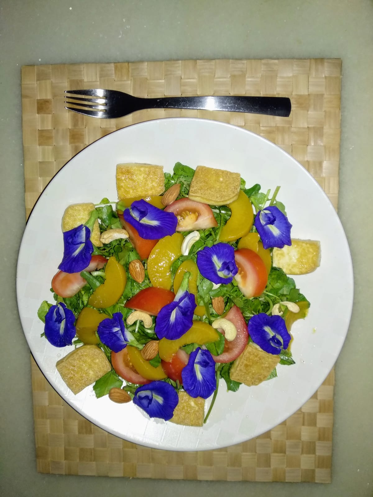 “Today is my low carb day so here’s my meal. The sweet and sour peaches contrasted well with the bitter watercress, the crunchy nuts contrasted well with the soft panfried tofu.
