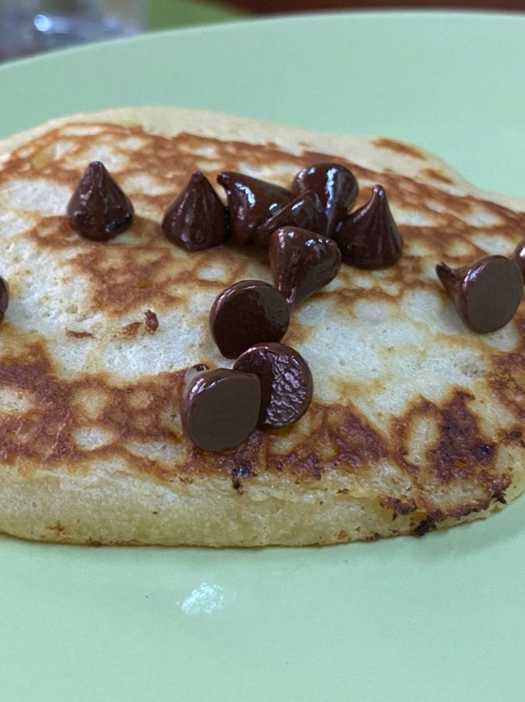 While I served the pancakes with a generous sprinkling of chocolate chips, pancakes pair just as well with maple syrup, honey, Nutella or ice cream.