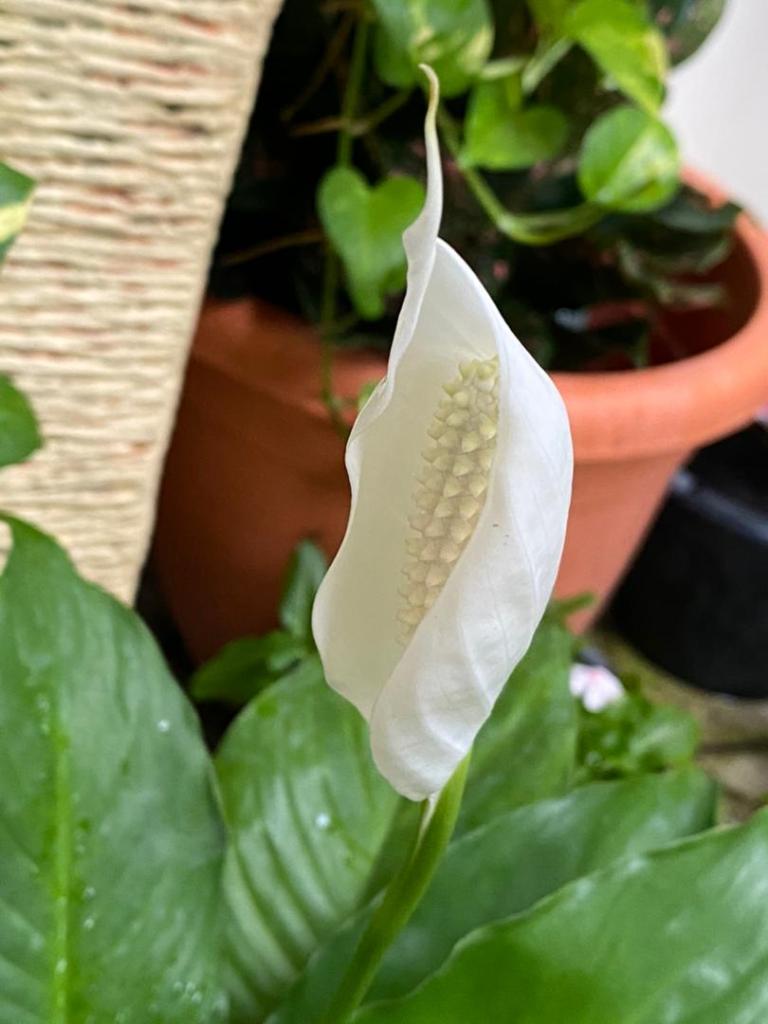 Last week, after many leaves and leaves, and did I say, leaves, a slender stalk grew from her heart. It grew so silently that I never noticed until I saw the little white bud peeking through. My peace lily finally flowered – a whole year later!