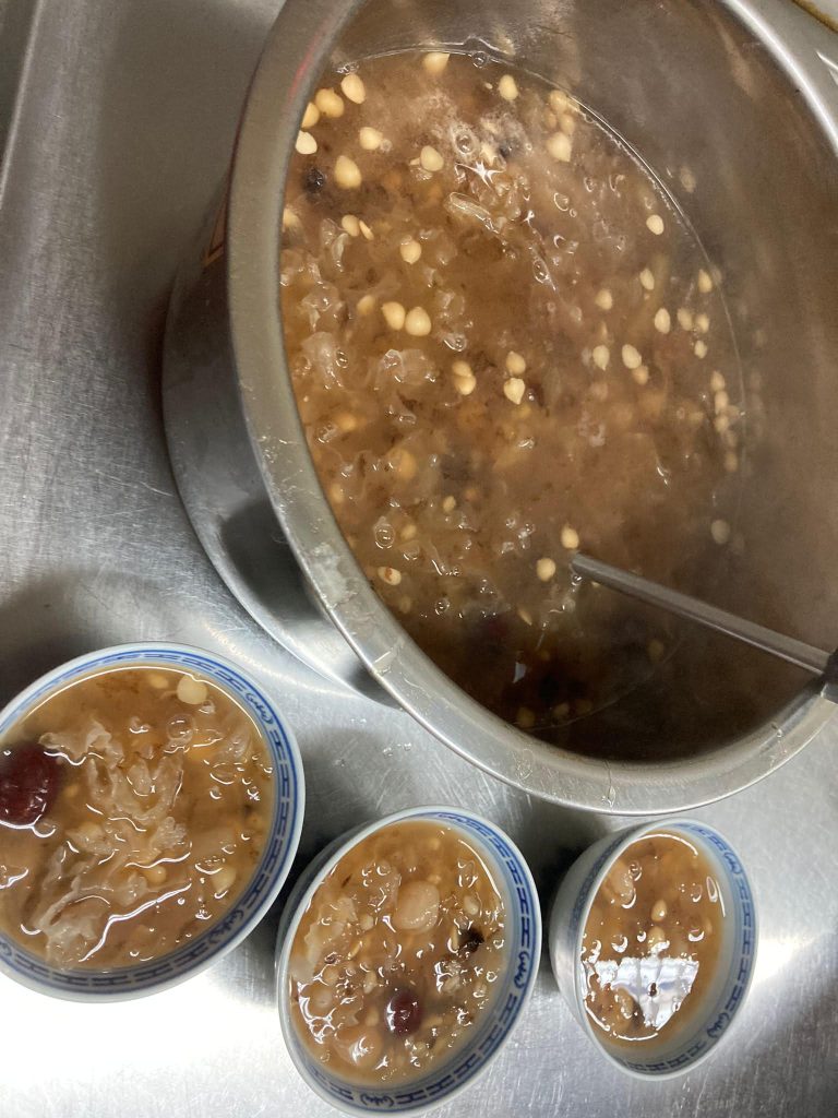 I made another attempt at making Cheng Teng (Chinese clear soup dessert). This time, I succeeded in making it look like a soup. I realise now that white fungus absorbs liquid, so that the ingredients become mushy and gooey if left overnight. I had to add more water and sugar to make it a soup again. The bitter almond, found in Chinese medicine shops, give the dessert a unique flavour and crunchy texture.