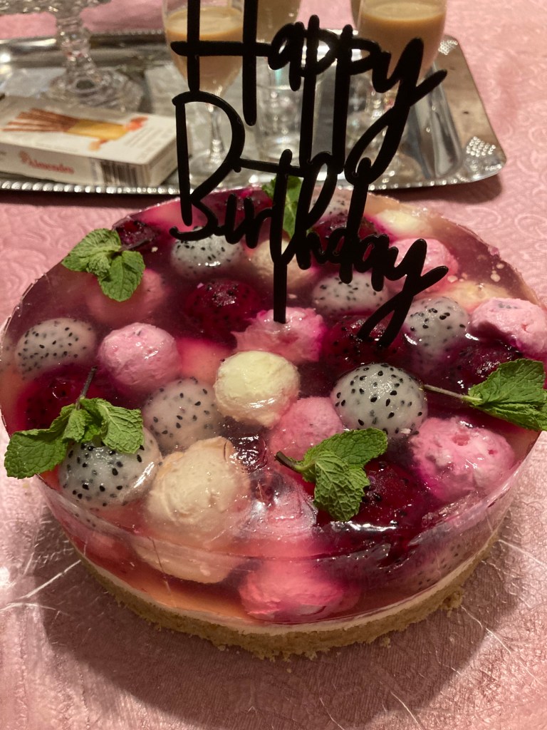 Elena never ceases to amaze us. She was given the challenge of making a birthday dessert with jelly. She decided on a jelly cheesecake with dragon fruit. She said that the hardest part was making the cream cheese balls.