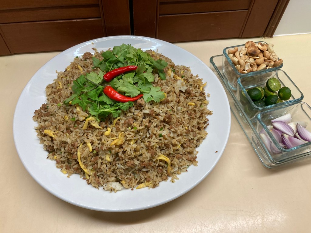 If you ever need a simple recipe that is guaranteed to be a success, try Thai olive rice. It’s served with egg omelet, cashew nuts, lime/calamansi, chili and shallots.