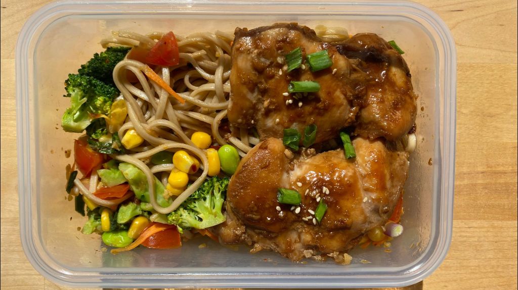Val was also into noodles, this time it was soba noodle salad with teriyaki chicken. She was clearing the fridge and pantry again.