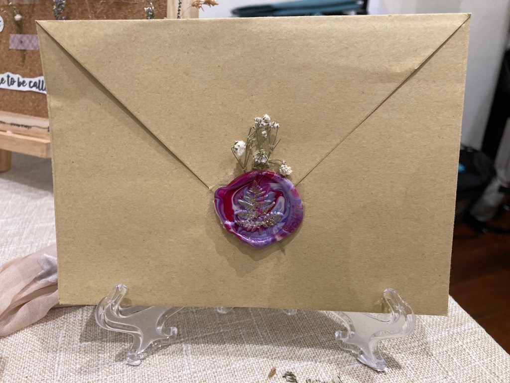 Clare and Anne go the extra mile. When you buy a pair of earrings as a gift, the earrings will be placed in an envelope and sealed with resin with wildflowers. You can also have the name of the person you will give the earrings to written in calligraphy.