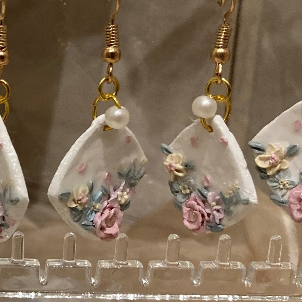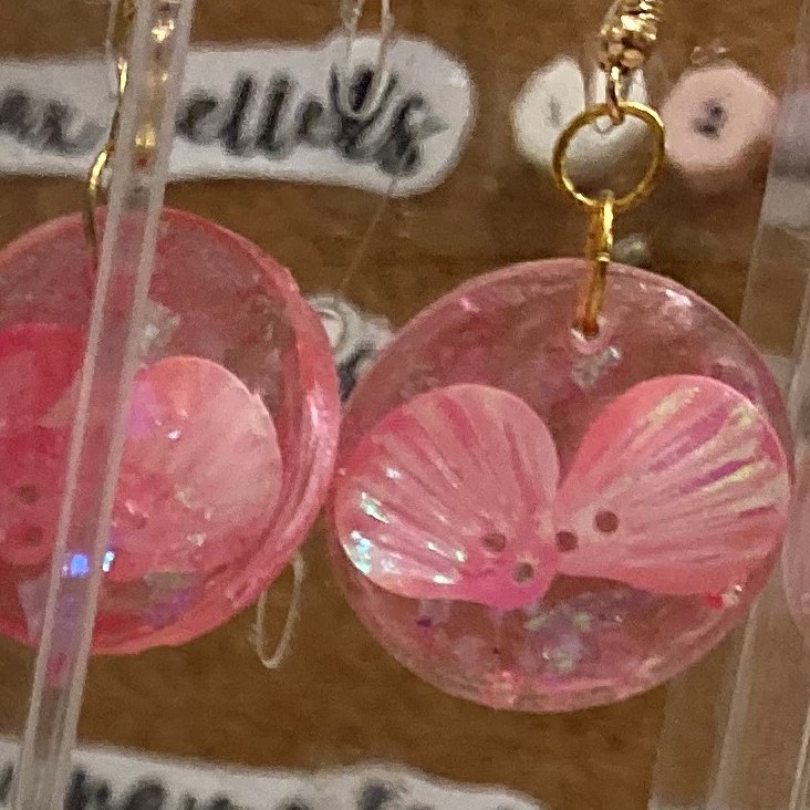 Clare makes clay earring while Anne makes resin earrings. Clare has an eye for fine details and delicate touches for petals and leaves. Anne is into martial arts, and she makes hardier earrings which are flower-inspired, but practical and hard to break.