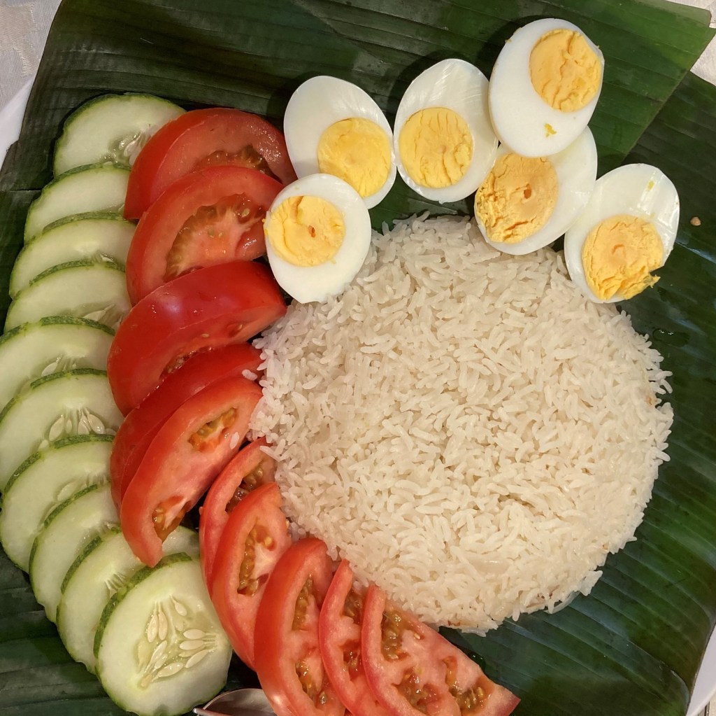 Nasi lemak with fried chicken served on banana leaves is always a treat for us. I remember a more simple version of nasi lemak in the school canteen as a child. It was nasi lemak with ikan bilis (fried anchovies), cucumber and sambal chili. It was my favourite dish.