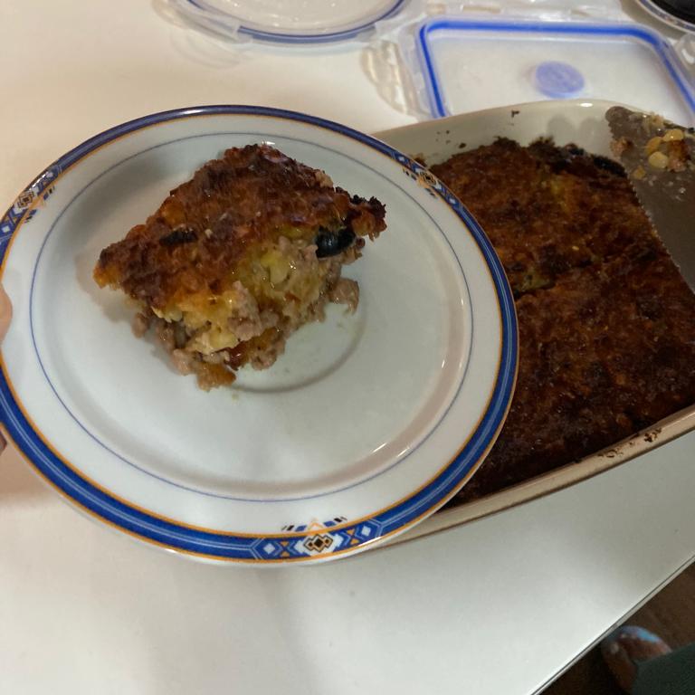 Rina sent a photo of an interesting dish she cooked – Pastel de choclo (Chilean minced beef pastel). Pastel de choclo is a pudding made from sweetcorn with meat or egg filling. It sounds like something I would like.