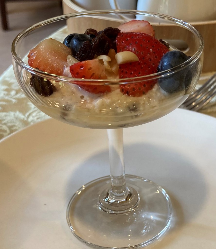 Fancy pastries are good for special occasions. Oats with yoghurt and fruits in a champagne glass adds a touch of class to a simple breakfast.