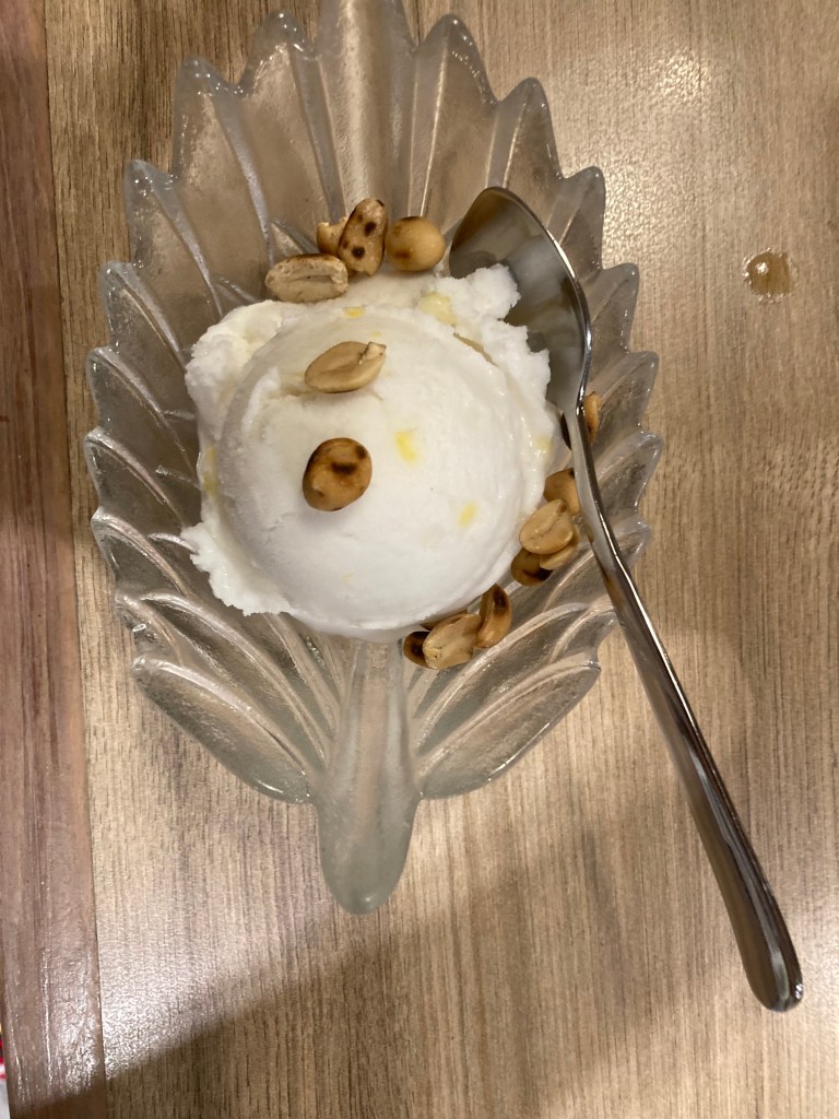 My favourite Thai dessert is coconut ice cream with peanuts. It’s a dessert from my childhood. There used to be ice cream shops in Bangkok that only served coconut ice cream with peanuts and jackfruit. I don’t know if they still exist. My brother has succeeded in making good coconut ice cream. It’s nice for a dinner party – or perhaps I should say: it’s cool!