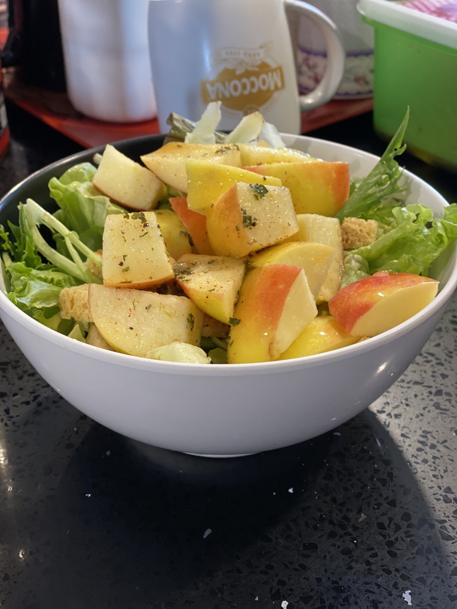 Once the dressing was done, I put the cherry tomatoes and lettuce at the bottom of the salad bowl, then arranged the quartered apples on top of that. I poured the orange juice liberally around the bowl so everything would be soaked through. The shredded chicken was placed front and centre before the dressing was poured over the salad. I was done – in less than 15 minutes!