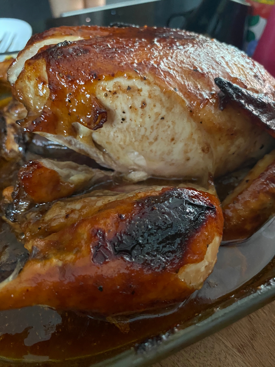 Yesterday’s roast was prepared with a generous lashing of barbeque sauce, and honey. Additionally, liberal peppering of black & cayenne peppers, (if you prefer a touch of the piquant spices), paprika, salt and a sprinkling of chicken stock – all flavoured to taste.