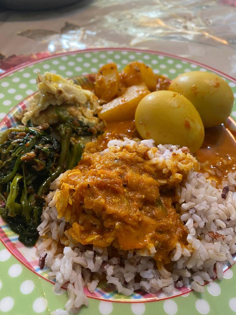 Suzie sent the first of her photos with a note: “Here is my homemade lunch! Rice with sardines in spicy tomato-based gravy, stir-fried cabbage with onions, carrots and tomatoes, fried egg with onions and a side of pickled mango (acar).”