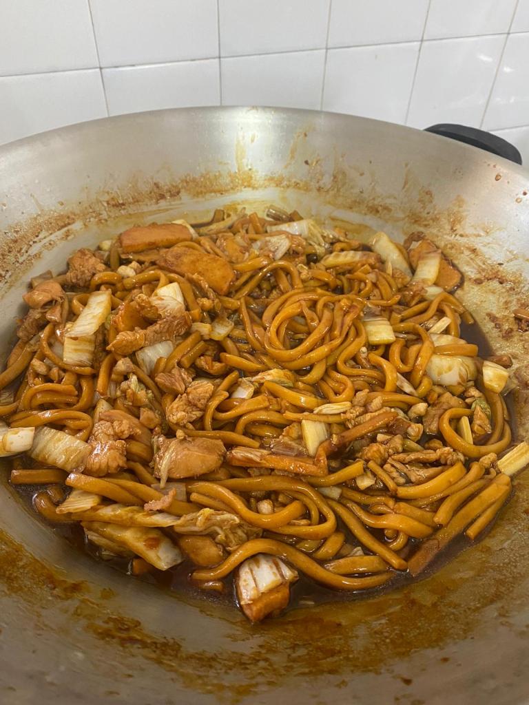 ⁃ Add in dark soya sauce (about 5tbs), oyster sauce (2tbs) and concentrated chicken stock (2tbs) or liquid chicken stock (1 cup), and then add in some water to partially submerged the noodles ( enough liquid to cook the noodles)