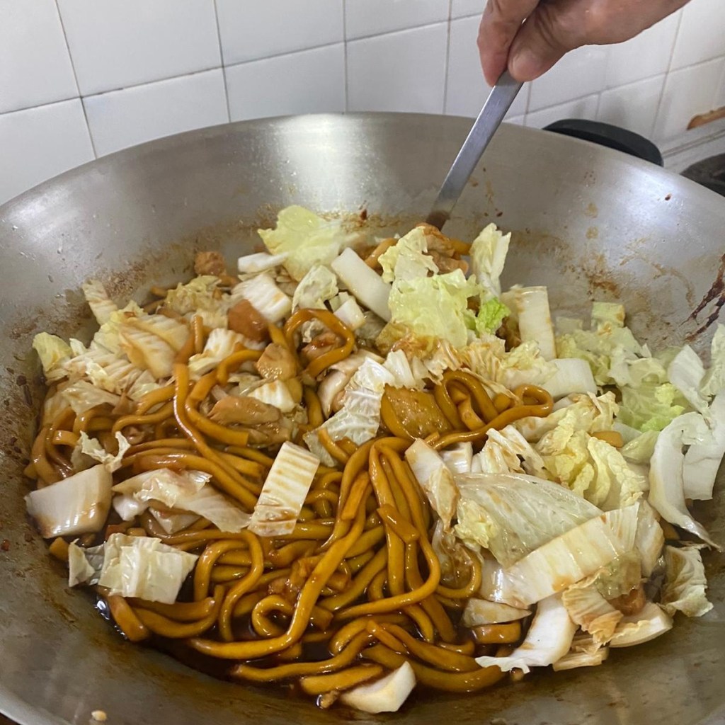 ⁃ Fry until partially cooked, and then add in the thick Hokkien mee noodles over medium heat