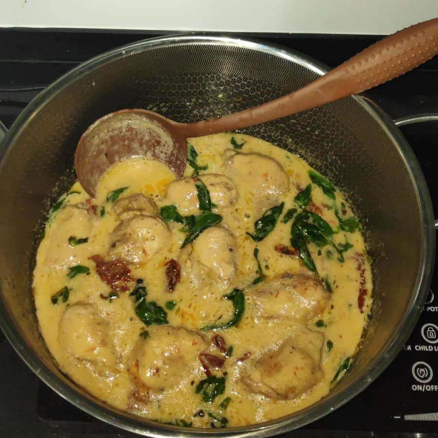 Her other dishes were not simple. San bei chicken is a popular Chinese dish. “San bei” means three cups. The main ingredients are rice wine, soya sauce and sesame oil. According to Elizabeth, tumeric chicken is a very easy-to-make tasty dish. Sambal mussels are spicy. Elizabeth said she was a bit too heavy-handed with the sambal and it was a bit too spicy for her.