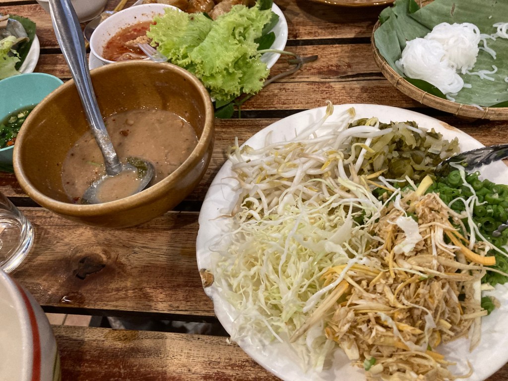 Some Northern Thai dishes are eaten with glutinous rice and others with kanom jeen (rice noodles). Apart from the good food, we enjoyed the company of a family from Lampang. It was interesting to see the similarity between Northern Thai cuisine and Vietnamese cuisine, especially with the use of rice paper to make fresh spring rolls.