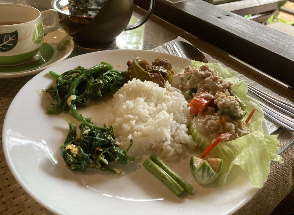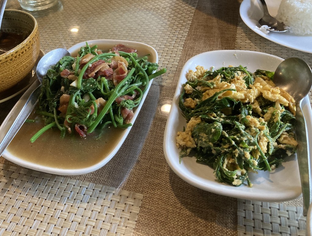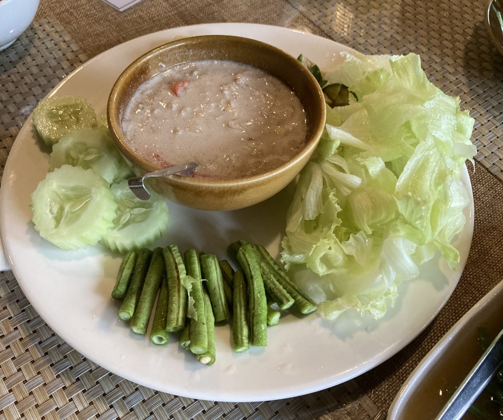 We had pumpkin leaves with bacon at a mountain resort in Chiangmai. We also had fried Chiang-da leaves (which is a type of herb) with eggs. These two dishes were new to me. The dish I enjoyed most was minced pork in coconut milk served with fresh vegetables.