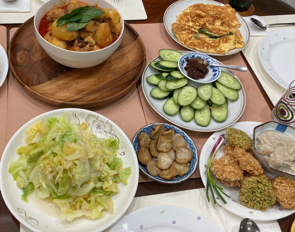 The theme was red and green. I decided on massaman curry, which is a less common Thai curry. You will recognise it by the potatoes and peanuts which are not found in other Thai curries. I cooked stir-fried cabbage with garlic and fish sauce, which is a simple and common Thai dish. I made a chicken-in-coconut-milk dip to go with rice crackers. The appetizer was sliced Japanese cucumber with a very hot Thai chili paste. My mother suggested that I cook an omelette with basil leaves.