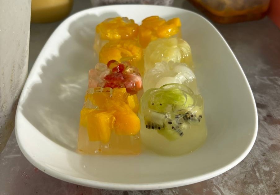 Our fridge has been full of jelly for Chinese New Year. Calvina and Constance have been making them for their special Chinese New Year project. Jelly is a typical Chinese New Year dessert. The home-made ones with fresh fruits are particularly nice, and they are great as a gift.