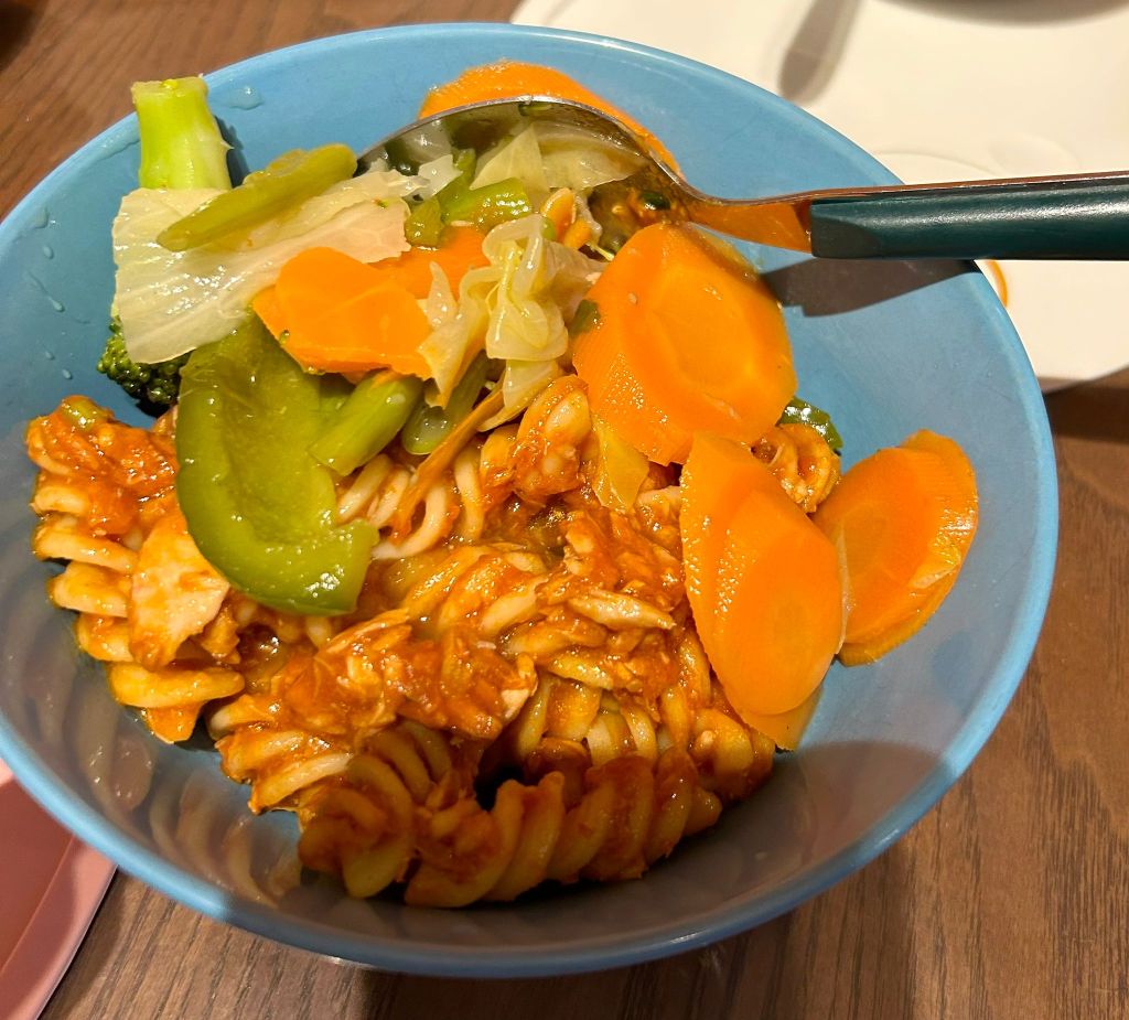 The next step was to marinate the chicken which we would steam. The chicken had to be left marinating for at least an hour before steaming. We also had to marinate the minced beef and minced pork for meatballs which we would also steam. While the chicken and minced meat were left marinating, we cut vegetables for steaming. Yes, our plan was to master the steaming method of cooking. But Ferninda had a special request for a simple no-meat dish for Fridays, so we had to fit a Spanish tuna and garlic pasta dish in somewhere. It didn’t take long to cook (20 minutes). It is a dish that can be cooked using one pan. It’s helpful when you don’t have much time to wash up.