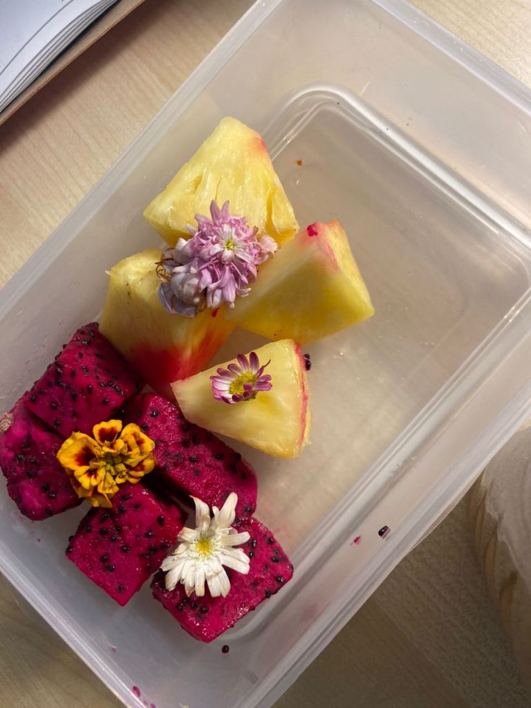 My friend Feisan usually sends me interesting photos. Yesterday she sent me a photo of edible flowers. She found a pack and she decided to try them. She put some in a drink and said that they did not have much taste. The bigger flowers didn’t taste too good, but they did make everything look beautiful. They looked best on fruits.