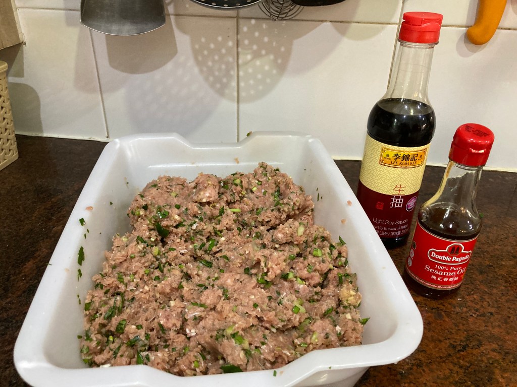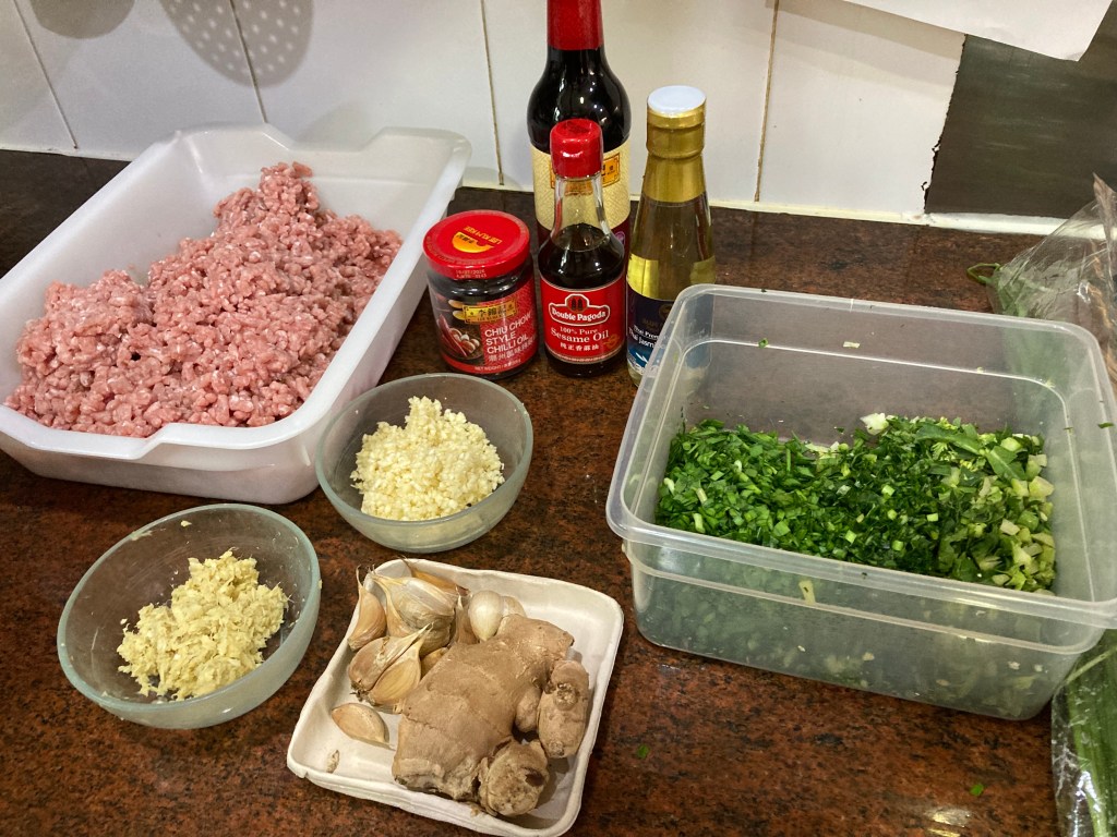 I made the dumpling filling early to avoid the crowd in the kitchen. The main ingredients were: minced pork, garlic, kai lan, ginger and chives. The seasonings were: soya sauce and sesame oil. The ingredients for the dipping sauce were: rice vinegar, soya sauce and chili oil. The dumpling skins were made of water and flour.