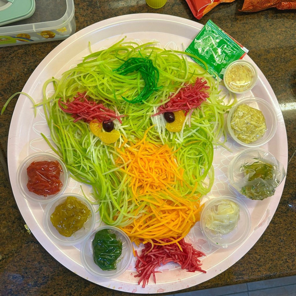 Suzie planned ahead and made a fruit jelly with a snake made from peach slices. Suzie is very talented and is an artist at heart. We had to have snakes because we are welcoming the year of the snake. Kathleen is another very talented person. She made the snake themed yusheng for the lohei. Mariah dyed some radish red, because we only had green radish.
