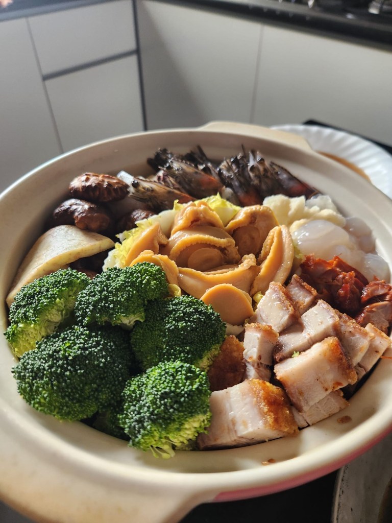 Belinda had her reunion dinner early because her mother came over to Singapore, and it was a good time to have a family reunion dinner. She had a home-made Chinese New Year dinner with traditional dishes with ingredients which symbolize abundance and prosperity like fish, chicken, pork and abalone. There was the Prosperity Toss of raw fish salad (yusheng), a must in Singapore.